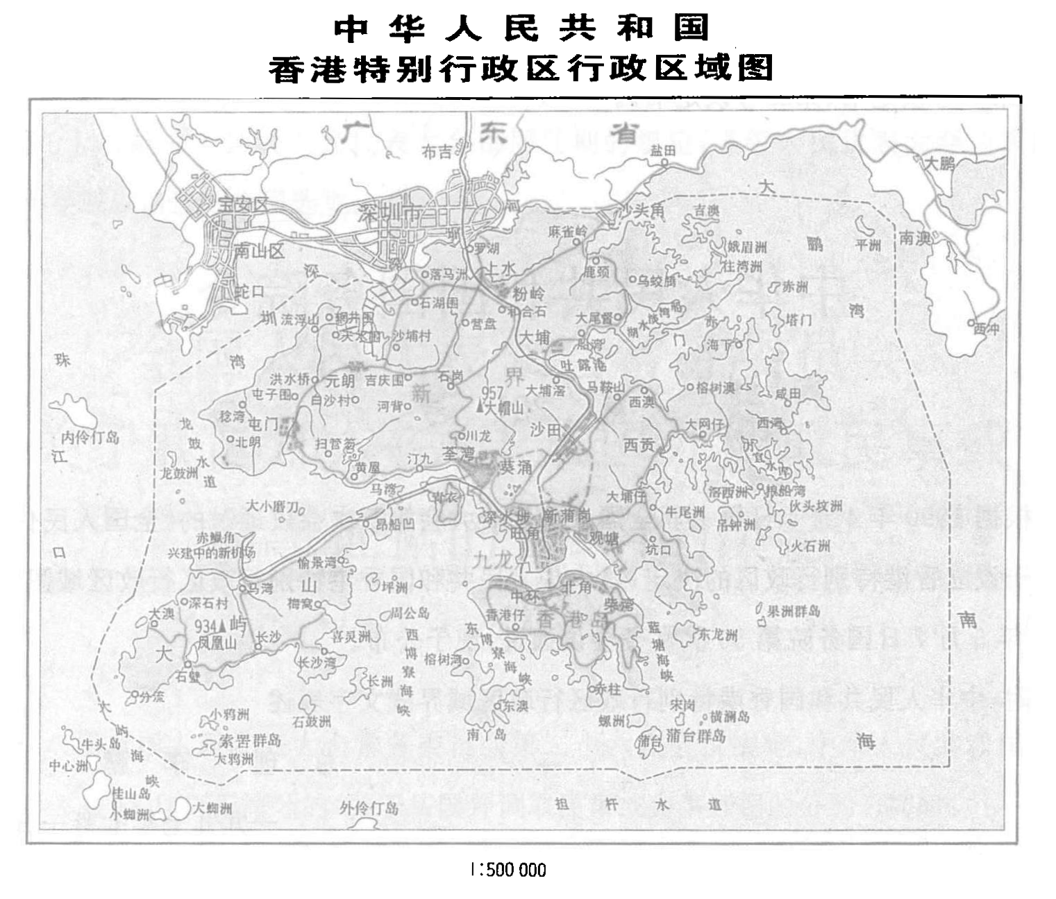 中文(简体):《中华人民共和国香港特别行政区行政区域图》(国令第221号) “ 中华人民共和国国务院令 第221号 根据1990年4月4日第七届全国人民代表大会第三次会议通过的《全国人民代表大会关于设立香港特别行政区的决定》,《中华人民共和国香港特别行政区行政区域图》已经1997年5月7日国务院第56次常务会议通过,一九九七年七月一日公布。 附:中华人民共和国香港特别行政区行政区域界线文字表述 总理 李鹏 一九九七年七月一日