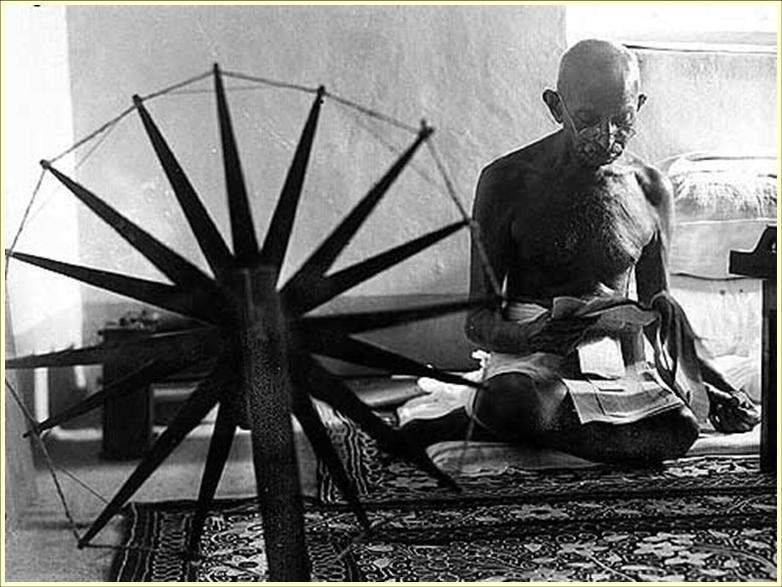 La rueca de Gandhi. La explotación de los campesinos indios por los industriales británicos había originado una extrema pobreza. Gandhi propuso como solución a esta situación potenciar el renacimiento de las industrias artesanales, y comenzó a usar una rueca como símbolo de la vuelta a la sencilla vida campesina que predicaba.