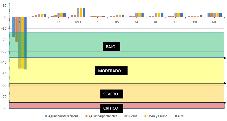 Los depósitos de combustibles constituyen fuetes de alto riesgo para la empresa y la urbe adyacente. Varios eventos alrededor del mundo han documentado que los tanques de combustible cerca de las poblaciones residenciales son instalaciones de alto riesgo. Existen numerosos métodos para poder estimar los impactos medio ambientales que puede provocar cualquier evento relacionado con combustible o cualquier otra sustancia peligrosa En la siguiente artículo pretendemos compartir con la comunidad de mantenedores un método para estimar los impactos medio ambientales mediante, “La Matriz de Impacto Ambiental”, método analítico, mediante el cual se puede asignar la importancia (I) a cada impacto ambiental posible de la ejecución de un proyecto en todas y cada una de sus etapas de manera independiente, dicha metodología, perteneciente a Vicente Conesa Fernández Vitora en 1997. La ecuación matemática empleada para determinar (I) está dada por, (±) naturaleza del impacto, (i) intensidad o grado probable de destrucción, (EX) extensión o área de influencia del impacto, (MO) momento o tiempo entre la acción y la aparición del impacto, (PE) persistencia o permanencia del efecto provocado por el impacto, (RV) reversibilidad, (SI) sinergia o reforzamiento de dos o más efectos simples, (AC) acumulación o efecto de incremento progresivo, (EF) efectos (tipo directo o indirecto), (PR) periodicidad, la particularidad de esta matriz lo constituye la incorporación de las Unidades de Impacto Ponderadas (UIP). Esto es: I=± [3i+2EX+MO+PE+RV+SI+AC+EF+PR+MC] Conciderando que cada factor representa solo una parte del medio ambiente (Ej: Aguas subterráneas, Aguas superficiales, Suelo Flora y fauna, Aire, Etc. ), es necesario llevar acabo las ponderaciones de la importancia relativa de los factores en cuanto a su mayor o menos contribución a la situación del Medio Ambiente (MA). En la Figura 2 mostramos los resultados del impacto ambiental ante una posible explosión de un tanque de Fuel – Oíl de una capacidad de 1000 m3 teniendo en cuenta los factores mencionados anteriormente. En los resultados del (I) mostrados anteriormente, se evidencia que los valores más altos de incidencia serían moderados, con un valor similar de -45 UIP (para el suelo y la flora y fauna) y un valor de -46 UIP en el caso de aire.
