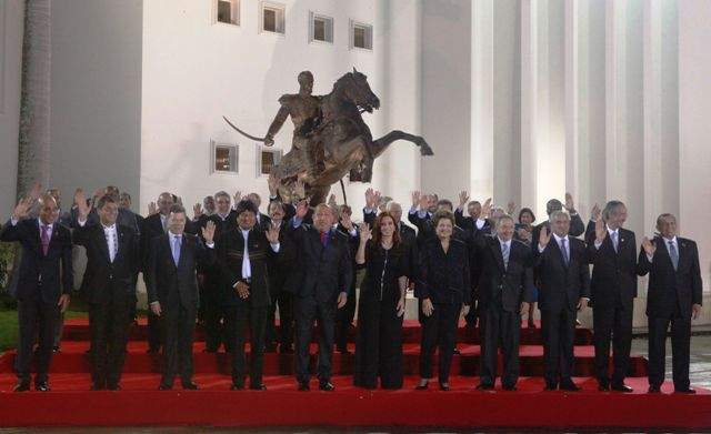 Los presidentes de izquierda a derecha: Rafael Correa de Ecuador, Juan Manuel Santosde Colombia, Evo Morales de Boliva, Hugo Chavez de Venezuela, Cristina Fernandez de Argentina, Dilma Rousseff deBrazil, Raul Castro de Cuba, Presidente electo Otto Perez de Guatemala, Alvaro Colom de Guatemala, Jose Lobo de Honduras (Atrás, de derecha a izquierda): Primer Ministro de Dominica Roosevelt Skerrit, Desi Bouterse deSuriname, Fernando Lugo de Paraguay, Daniel Ortega de Nicaragua, Felipe Calderon de Mexico, Ricardo Martinelli de Panama, Leonel Fernandez de Republica Dominicana, Jose Mujica de Uruguay, Primer Ministro de Barbados Freundel Stuart y Primer Ministro de Granada Tillman Thomas en CELAC, Caracas, 2 de diciembre de 2011.