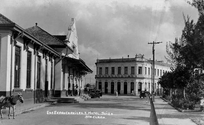 Santa Clara. Parque de los Mártires con el Hotel Suizo al fondo y la Terminal de Ferrocarriles a la izquierda.