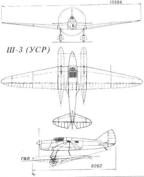 Tres vistas del Shavrov Sh-3 USR