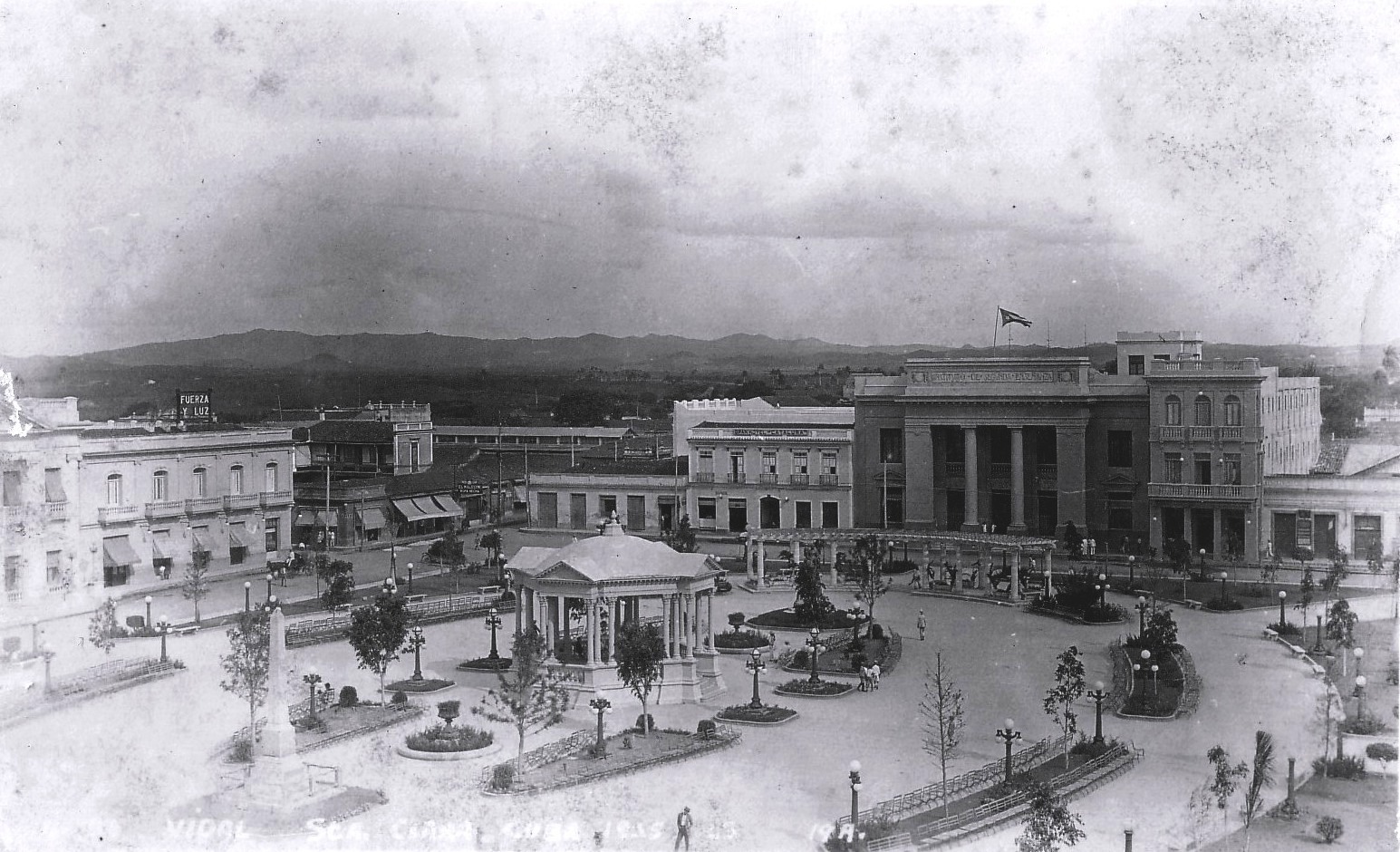 Santa Clara. Flanco sur del Parque Leoncio Vidal una vez demolida la Parroquial Mayor. En la imagen se observa, además, la fachada del Hotel Cataluña, inexistente en la actualidad, así como el edificio inicial del hoy Hotel Florida. Al fondo, la Sierra Alta de Agabama.