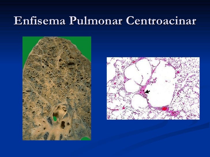 Enfisema centrolobulillar: También denominado enfisema centroacinar, comienza en los bronquiolos y se extiende periféricamente. Se caracteriza porque el área afectada está en el lobulillo proximal, en especial por la destrucción de los bronquiolos y la dilatación de los lóbulos superiores sin afectar a los alvéolos distales.