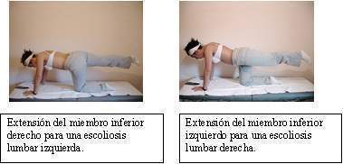 - Posición cuadrúpeda, realizamos un movimiento combinado de extensión del miembro inferior derecho y elevación del miembro superior izquierdo (esoliosis dorsal derecha y lumbar izquierda), y luego un movimiento de extensión del miembro inferior izquierdo y elevación del miembro superior derecho (escoliosis dorsal izquierda y lumbar derecha)