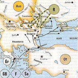 El 25 de marzo de 1854 la coalición entre Francia, el Reino Unido y el Reino de Piamonte declaran la guerra a Rusia y mandan un cuerpo expedicionario a la península de Gallípoli, en Turquía, para ayudar a los turcos a recuperar los territorios perdidos en el Danubio. Las tropas expedicionarias avanzaron hasta Bulgaria, obligando a los rusos a abandonar el sitio de la ciudad de Silistria, pero luego se vieron frenados ante la ciudad de Dobrudja, donde la enfermedad de el cólera diezmó el ejército.