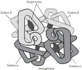 La molécula de hemoglobina está constituida por una porción proteica llamada globina (compuesta por 2 pares de cadenas polipeptídicas diferentes que contienen numerosos aminoácidos) y 4 grupos prostéticos nombrados “hem” en cuyo centro se localiza un átomo de hierro; de manera que la molécula de hemoglobina está formada por 4 subunidades, cada una de las cuales posee un grupo hemo unido a un polipéptido. Las variaciones en las cadenas polipeptídicas dan origen a diferentes tipos de hemoglobinas. Por ejemplo; las hemoglobinas normales del adulto (Hb A1 y A2), y la del feto (Hb F) que tiene gran afinidad por el oxígeno.