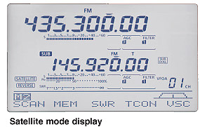 El modo de satélite sincroniza las frecuencias de enlace ascendente (transmisión) y de enlace descendente (recepción), y rastrea las frecuencias en el mismo paso de sintonización. Esta función coincide con los satélites del modo normal y del modo inverso. La compensación del efecto Doppler se puede realizar fácilmente con 20 canales de memoria de satélites alfanuméricos almacenan frecuencias, ajustes de modo y tono para una rápida configuración.
