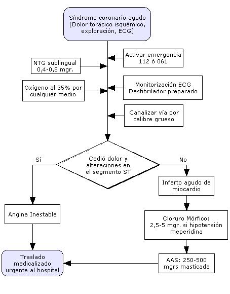 La trombolisis se valorará en las siguientes circunstancias: Existencia de síntomas sugestivos de IAM y alteraciones ECG, aún sin disponer de marcadores bioquímicos. Tiempo previsto de traslado para acceder al hospital superior a 30 minutos. Ausencia de contraindicaciones. Menos de 2 horas desde el inicio de los síntomas. Disponibilidad de personal entrenado y acuerdo previo con el centro hospitalario de referencia.