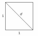 d2 = 12 + 12 = √2, de donde, d = √2 que no es un número racional puesto que no se puede expresar como una fracción, en otras palabras, la expresión decimal √2 tiene infinitas cifras en la parte decimal sin regularidad alguna.