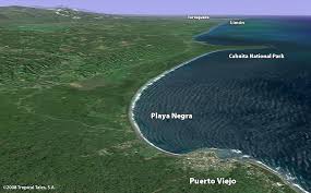 Playa Negra Cahuita. Ubicada esta playa a 2 km de Cahuita, en el cantón de Talamanca, en la provincia de Limón en Costa Rica. Playa de arena oscura y fuerte oleaje, está destinada a sol, baño de mar, buceo, surf y fotografía. Transitable durante todo el año. Galardonada por su conservación y protección de la Bandera Azul Ecológica que certifica los altos estándares ambientales y de seguridad que cumple.