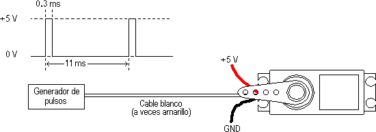 Dependiendo del modelo del servo, la tensión de alimentación puede estar comprendida entre los 4 y 8 voltios. El control de un servo se reduce a indicar su posición mediante una señal cuadrada de voltaje. El ángulo de ubicación del motor depende de la duración del nivel alto de la señal. Cada servo motor, dependiendo de la marca y modelo utilizado, tiene sus propios márgenes de operación. Para el servomotor Futaba S3003, los valores posibles de la señal en alto están entre 0,3 y 2,1 ms, que posicionan al motor en ambos extremos de giro (0° y 180°, respectivamente). El valor 1,2 ms indica la posición central, y otros valores de duración del pulso dejarían al motor en la posición proporcional a dicha duración. Es sencillo notar que, para el caso del motor anteriormente mencionado, la duración del pulso alto para conseguir un ángulo de posición θ estará dada por la fórmula t = 0,3 + θ/100 Donde t está dado en milisegundos y θ en grados.