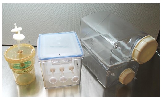 Este sistema consta de dos recipientes horizontales acoplados uno sobre el otro con una capacidad de 3 L. Cada uno presenta una abertura de 80 mm con empaques de silicón y tapas de rosca, se conectan entre sí por una manguera en la parte inferior del recipiente. En sus extremos superiores, un orificio conectado a un filtro permite la entrada de aire estéril.