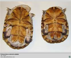 Los machos tienen el carapacho más estrecho, el peto cóncavo y la cola más gruesa. En esta especie los ejemplares más grandes son los machos.