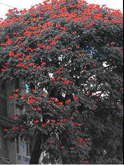 Tulipán africano (Spathodea campanulata). Árbol mediano. Flores de corola campanulada, irregular, expandida unilateralmente, de color rojo intenso y con márgenes recortadas de color anaranjado. Los frutos son cápsulas alargadas, leñosas y erectas con numerosas semillas aladas.