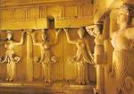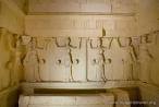 El diseño de la cámara central que contenía dos camas funerarias de piedra y un edículo, imita la disposición de una casa peristilo: cinco medias columnas y diez cariátides femeninas esculpidas en alto relieve sobre losas de piedra caliza apoyadas al arquitrabe friso dórico de bóveda de cañón, con sus triglifos y metopas que abarcan la sala a media altura.