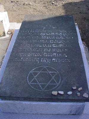 Preside el “campo santo” una tarja en forma de pilastra truncada, colocada de forma inclinada, en la que está grabada las siguientes palabras: “En memoria de la construcción del cementerio el 30 de marzo de 1924 colocada por la mujer Yeuda G. Maya”. La misma se encuentra en el lado derecho del recinto. En el lado izquierdo se encuentra una tumba especial, la cual está destinada a incinerar los libros u objetos religiosos cuando están en desuso. Se le nombra Crematorio de Libros. Allí también presenta una piedra en forma de pequeña pilastra, precedida por una pirámide. Estos dos elementos antes mencionados, simbólico uno y con fines utilitario el otro, son precedidos por un jardín, actualmente perdido. Sigamos adentrándonos en la intimidad del recinto. Es de sumo interés la disposición de los sepultados. [[