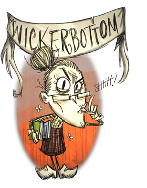Wickerbottom. Es el quinto personaje desbloqueable (Se necesita 1280 puntos de experiencia). Es una bibliotecaria vieja e inteligente que escribe y publica sus propios libros. También es capaz de identificar diferentes tipos de fauna y flora por su nombre científico. Es autora de varios libros, y puede fabricar diferentes tipos de ellos. Puede crear prototipos de la máquina de ciencia y algunas recetas del motor de alquimia. Padece de insomnio y también recibe una pérdida de cordura mayor cuando consume algún alimento en mal estado.
